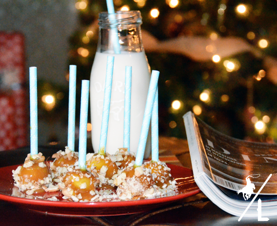 With a melon baller just scoop out sections of green apples. This is the hardest part, but after a few tries I finally made perfect little balls. While the caramel is heating up place straws or cake pop sticks into the apples. Then dip them in the caramel, sprinkle on some crushed peanuts and place on a cookie sheet.